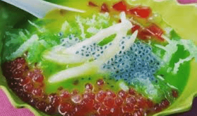 4,4Es Buto Ijo, a typical Kediri drink, consists of pearl sago, palm fruit, young coconut, green beans and nata de coco, served with ice made from pandan leaves or melon syrup. The name "Buto Ijo" comes from a trader named Roni, with "buto" from his mother's nickname, Bu To, and "ijo" meaning green in Javanese, referring to the drink's color.
