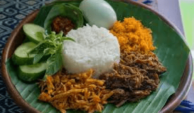 4,4Nasi krawu, a typical Gresik dish with roots from Madurese ancestors, consists of white rice with shredded beef in spicy spices and a sprinkling of serundeng or poya made from grated coconut. Equipped with shrimp paste chili sauce, salted egg, beef innards and stew sauce, nasi krawu is served wrapped in banana leaves to add to the enjoyment.